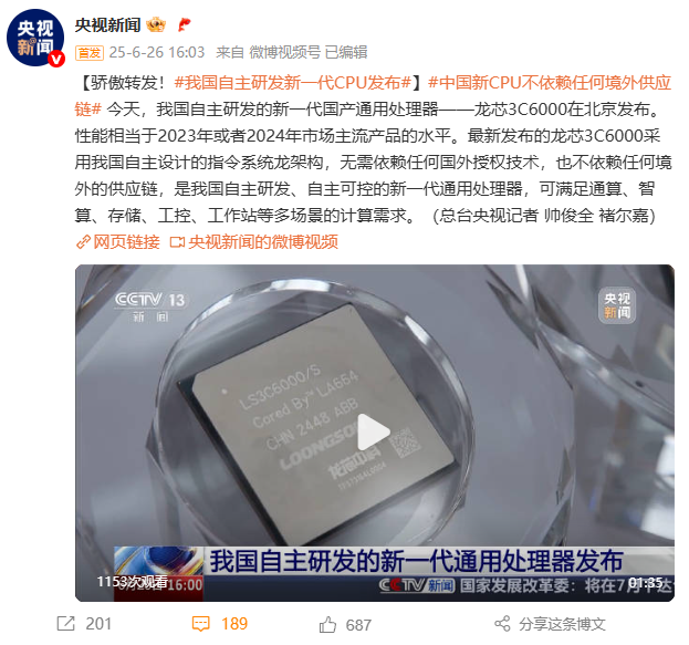 龙芯3C6000正式发布 央视点赞:中国新CPU不依赖任何境外供应链
