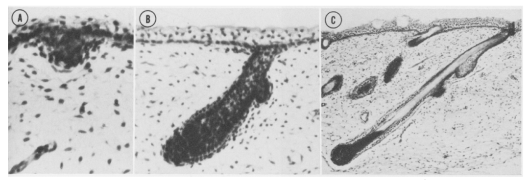 胎儿头顶后方头皮中毛囊的发育过程。图 A 为 10 周,图 B 为 16 周,图 C 为 18 周。随着毛囊的向下生长,毛囊逐渐愈加倾斜。论文作者推测这一改变由皮肤受到牵拉所导致。图片来自参考文献[1]