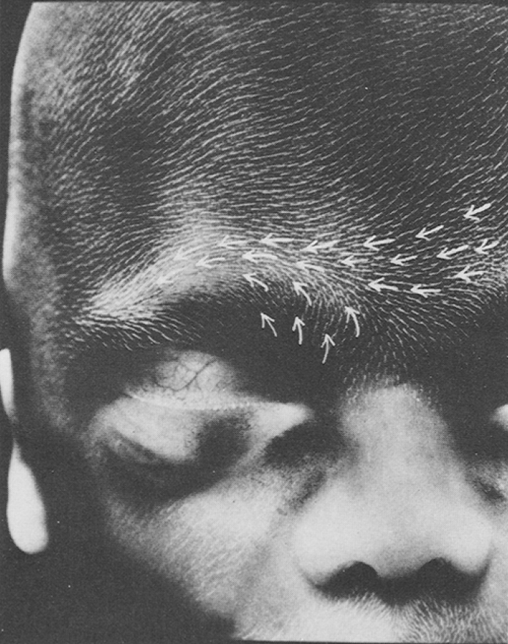 这个理论不仅解释了发旋的成因以及为什么大多数人的发旋都位于头顶后方,也顺带解释了额面部的毛流规律。面部的毛发方向总是从一些固定点向外延伸(见下图),论文作者认为这也是面部毛囊在生长过程中受到发育的面部组织牵拉而产生的结果。