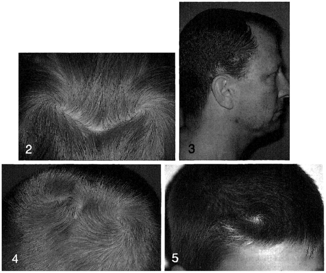 除了毛囊的组织学证据外,论文作者还用病例反向证明了大脑发育对于毛旋的影响。作者列举了脑膨出、双脑畸形、塔形脑症以及接近无脑畸形的严重小头畸形等大脑结构显著异常的病例,每一个病例的头毛分布模式也都显著异常,且都与大脑畸形的结构改变相匹配,说明当胎儿的大脑没能正常发育时,发旋的形成也会因此受到影响。