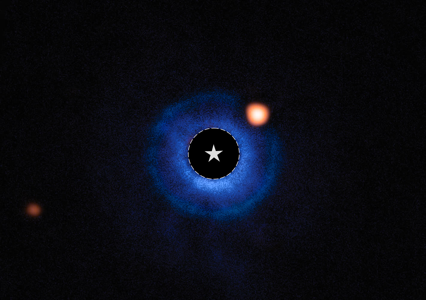 上图是使用欧洲南方天文台(ESO)甚大望远镜(VLT)和韦伯望远镜(Webb)MIRI数据合成的。主恒星TWA 7用一个圆圈和一个星号标记。它周围的蓝色代表VLT球体仪器的数据,显示了恒星周围的碎片场,而韦伯望远镜(Webb)MIRI的数据则以橙色显示。右上角的橙色斑点是新的行星候选体;左下角的另一个橙色斑点很可能是一颗无关的背景恒星。