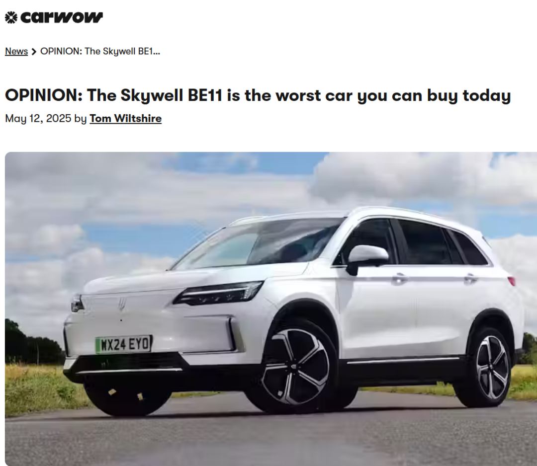 接下来更是重量级选手:Skyewell BE11(国内叫创维 EV6 ,已停产),Tom 称之为“最无聊的车”……说实话,脖子哥一直在扪心自问,这车是怎么登陆英国的?不会是哪个冤大头经销商被忽悠了吧……