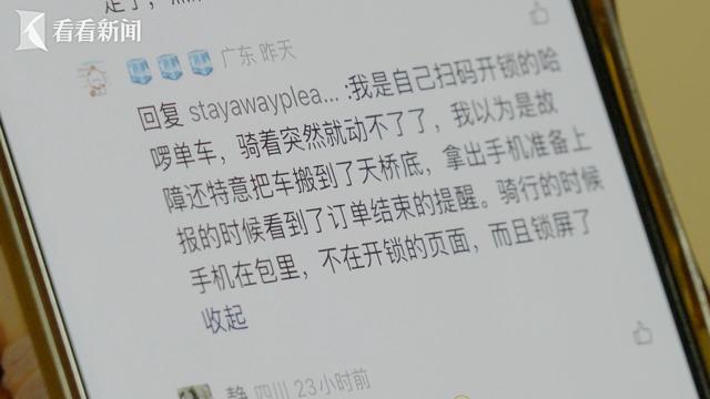 但哈啰的回应又跟工作人员的说法有矛盾表示,速度只要大于每秒0.5米,车锁就会拒绝执行关锁指令。另外,用户在骑行中摩擦误触手机上的还车键,也可能导致锁车。换句话说,车辆在行进过程中,确实是可以锁车的。