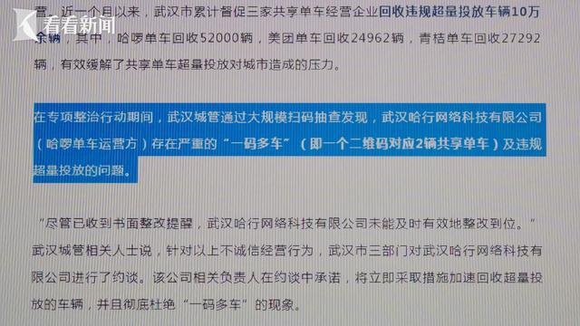 另一则消息也值得关注。8月13日,武汉发布提到,城管通过大规模扫码抽查发现,哈啰单车存在严重的“一码多车”及违规超量投放的问题。