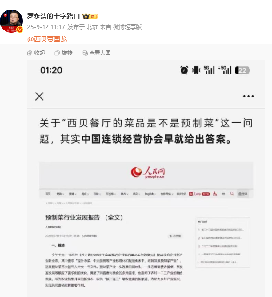 9月13日,罗永浩发微博@贾国龙,内容为 关于“西贝餐厅的菜品是不是预制菜"这一问题,其实中国连锁经营协会早就给出答案,预制菜行业发展报告 (全文)表示,数据显示,真功夫、吉野家、西贝等连锁餐饮企业预制菜占比达80%以上。