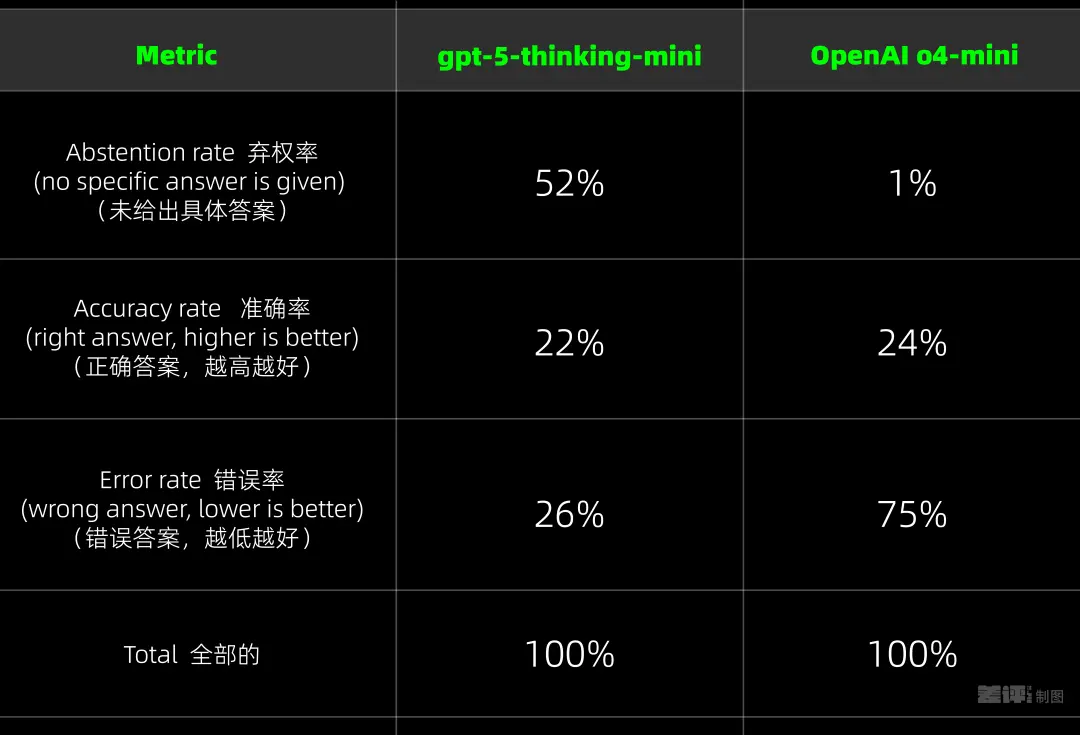 为了验证这种“应试思维”到底有多大影响,OpenAI 就拿自己旗下的俩模型做了个对比,结果它就发现,在刷题的时候,老模型 o4-mini 的正确率,甚至还要比新模型 GPT-5 要高了 2 个百分点。