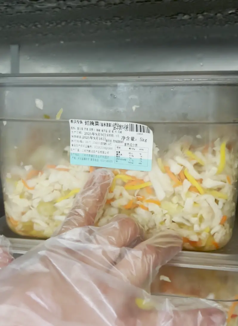 凤凰网科技在另一家西贝后厨看到,冰柜里有各种准备好的备菜青菜,有腌制泡菜显示生产日期为9月9日。