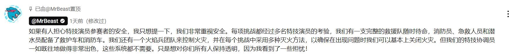 面对大量负面评价,野兽先生迅速作出回应。他先在YouTube视频下发布评论,强调将安全视为重中之重,透露所有挑战均经多名特技演员预先测试,现场常驻配备消防车与救护车的专业救援队,并配备专业控火团队及多重灭火系统。