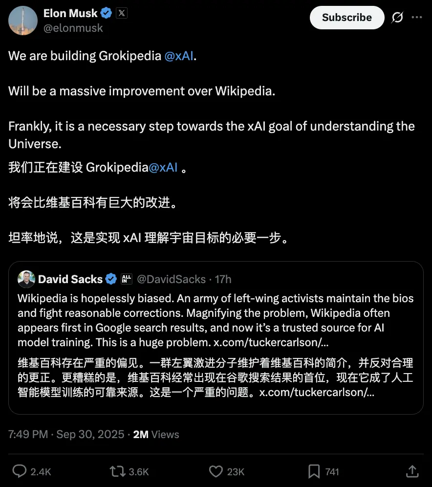 9月30日,马斯克在X上连续发文,宣布xAI正在打造一款名为“Grokipedia”的新知识平台,并直指其目标是超越维基百科。