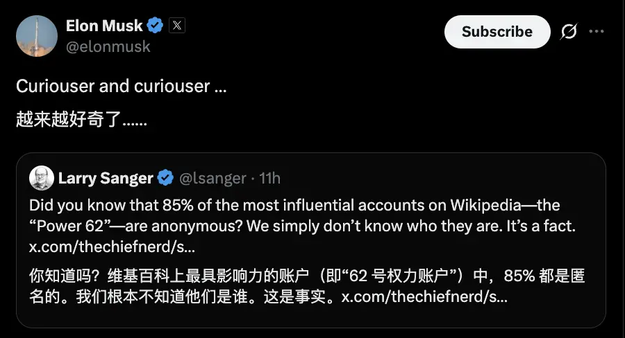据“AI普瑞斯“报道,事情的起因是维基百科联合创始人Larry Sanger提到,“维基百科最有影响力的账号中有85%是匿名的,我们根本不知道他们是谁。”马斯克转发评论称“越来越奇怪了”。随后他表示,Grokipedia将是维基百科的“大幅改进版”,更是xAI实现“理解宇宙”宏大目标的必要步骤。