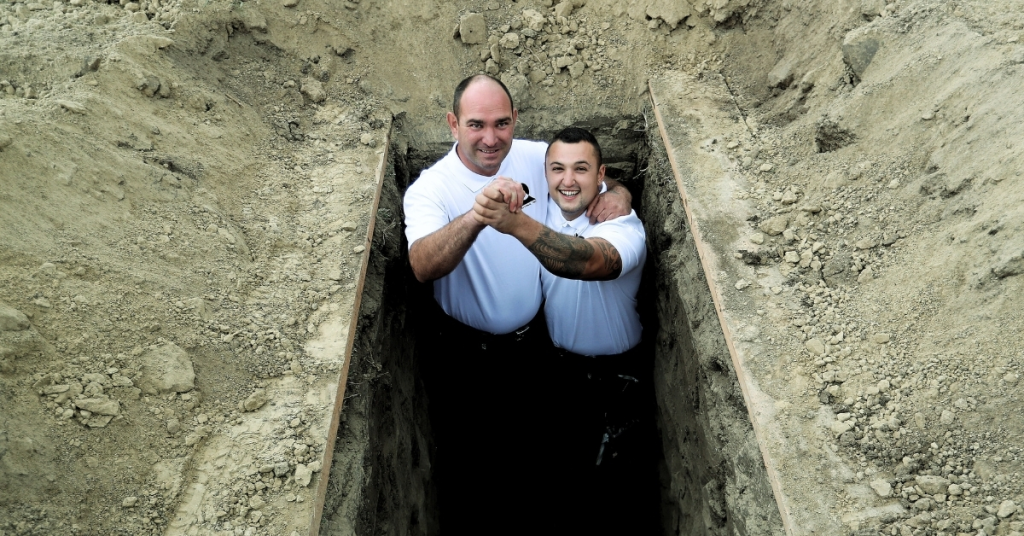 今年的冠军是来自匈牙利选手拉斯洛·基斯和罗伯特·纳吉,按照赛制,他们两人一组,要求挖掘一个标准尺寸的墓穴(长2米,宽08米、深1.6米),挖好后再按照要求把土填回去,打造一个完整的坟墓。