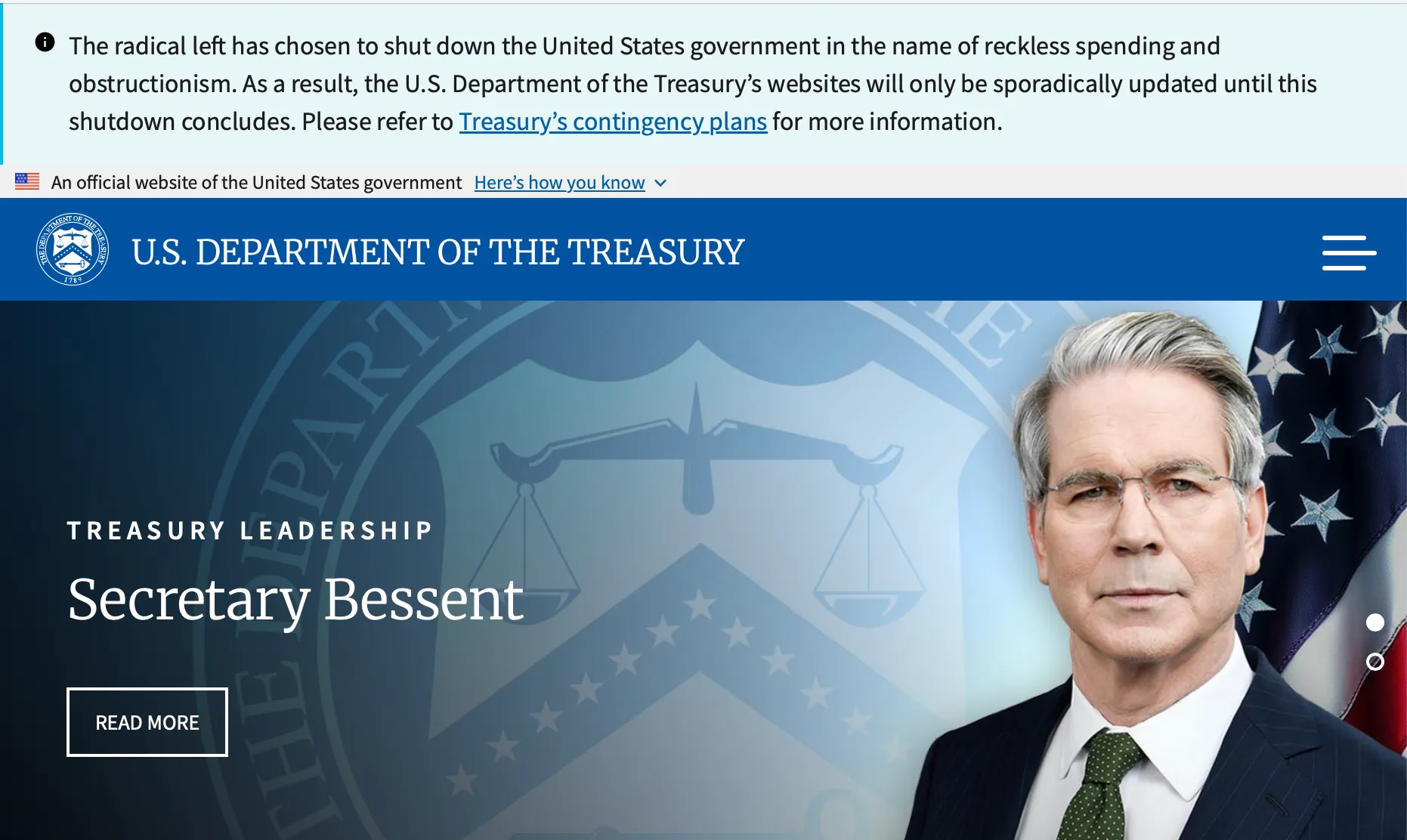 此外,财政部网站的横幅则称民主党以“鲁莽支出和阻挠主义”为名关闭了政府。白宫官网不仅指责民主党,还增加了一个计时器,显示本次政府停摆已持续时间。