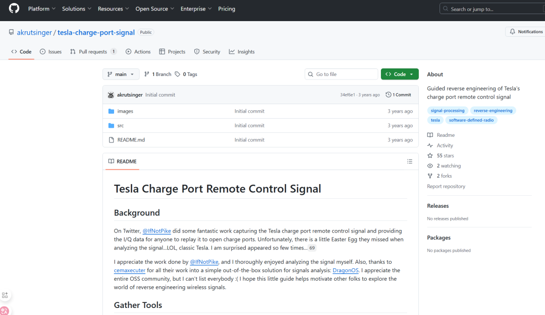 并且几年前就有老哥在 GitHub 上分享了特斯拉充电盖遥控的控制代码。真的属于是公开的秘密……