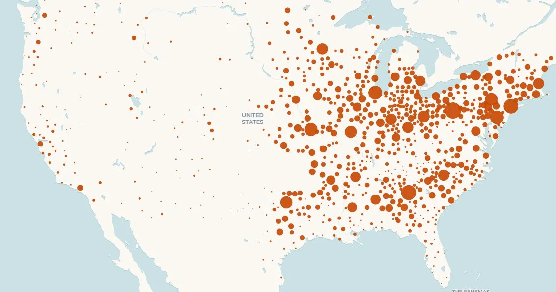 1850年美国城市的就业情况。每个圆点代表一座城市,圆点大小显示当地就业人口数量。1850-1940年期间,见证了美国城市体系从以农村为主转型为先进制造业与服务业经济的关键阶段。