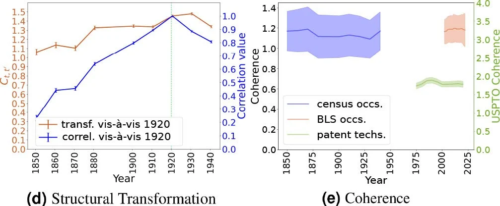 研究团队收集了包括6.5亿份美国人口普查数据、600万项专利及诸多历史资料,细致梳理了美国170年来城市经济演化轨迹。主要作者Simone Daniotti表示,美国城市系统整体呈现出从工艺制造业逐步转向服务与高新技术产业的改变,但“经济内聚性”始终保持稳定——即城市的多元经济活动之间,始终有着较强的相关性。