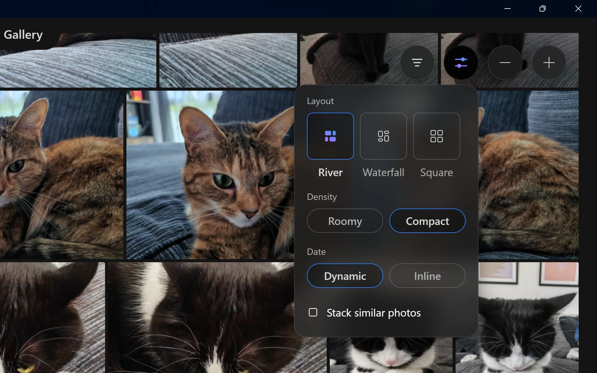 Gallery菜单还允许用户对布局进行自定义,可选择“River”、“Waterfall”、“Square”三种模式,还能在“Roomy”或“Compact”密度选项间切换。