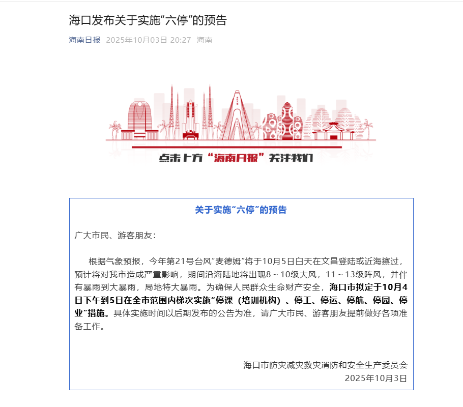 为确保人民群众生命财产安全,海口市拟定于10月4日下午到5日在全市范围内梯次实施“停课(培训机构)、停工、停运、停航、停园、停业”措施。