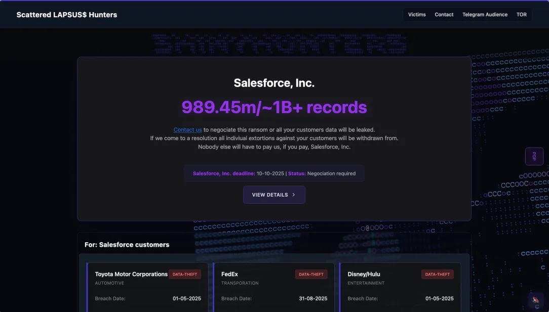 一个黑客组织近日上线了一个专门用于敲诈受害者的网站,威胁将公开其从企业云数据库——Salesforce运营的数据库中窃取的约十亿条客户数据记录。这个松散团体曾以Lapsus$、Scattered Spider及ShinyHunters等名号活动,现已在暗网上发布名为“Scattered LAPSUS$ Hunters”的专属数据泄露网站。