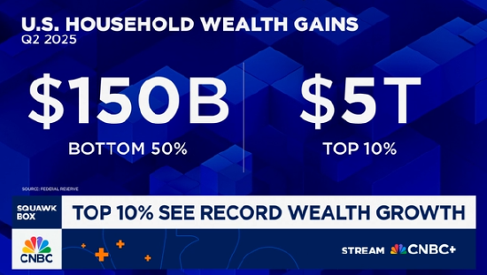 美联储数据显示,过去一年所有财富群体均实现财富增长,其中美国收入后 50% 人群的净资产在过去 12 个月增长了 6%。但财富增长速度最快的仍是最顶层群体:收入前 1% 人群过去一年的财富增加了 4 万亿美元,增幅达 7%,其财富规模在第二季度创下 52 万亿美元的历史新高。