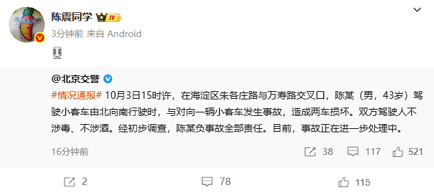 北京交警针对昨日发生的一起备受关注的交通事故进行通报:10月3日15时许,在海淀区朱各庄路与万寿路交叉口,陈某(男,43岁)驾驶小客车由北向南行驶时,与对向一辆小客车发生事故,造成两车损坏。