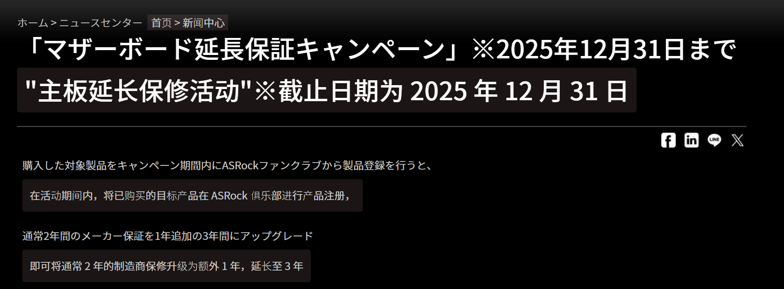 针对部分AMD锐龙9000系列处理器在华擎主板上出现的烧毁问题,华擎日本宣布,将为日本地区的用户提供延长一年保修服务。