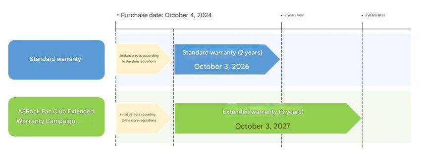 根据华擎日本的公告,凡是在2025年9月29日至12月31日期间,通过ASRock Fan Club完成注册的用户,其Intel Z890/B860或AMD X870/B850主板,可以享受额外一年的保修服务,即总共三年的保修期。