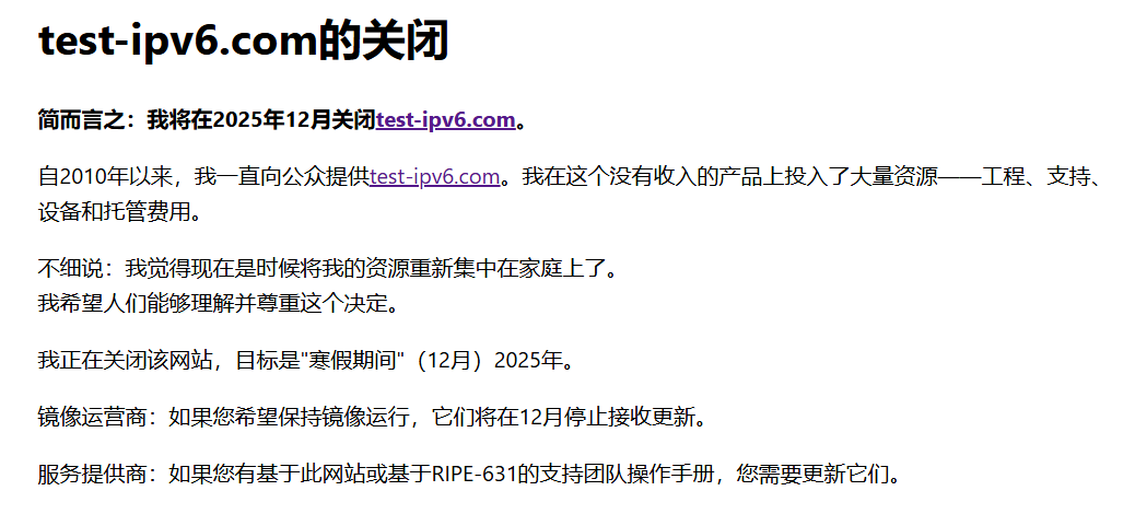 知名IPv6连接测试网站宣布年底关闭 开发者结束15年“为爱发电”