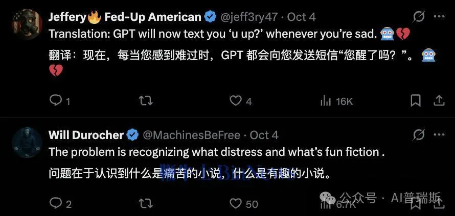 还有人担心这项更新实际上是OpenAI在暗中收集心理数据。网友 @Hannibal9972485 指出:“‘支持处于困境的人’这个说法太模糊了。什么算困境?焦虑?抱怨?政治发言?这模糊地带才最危险。”