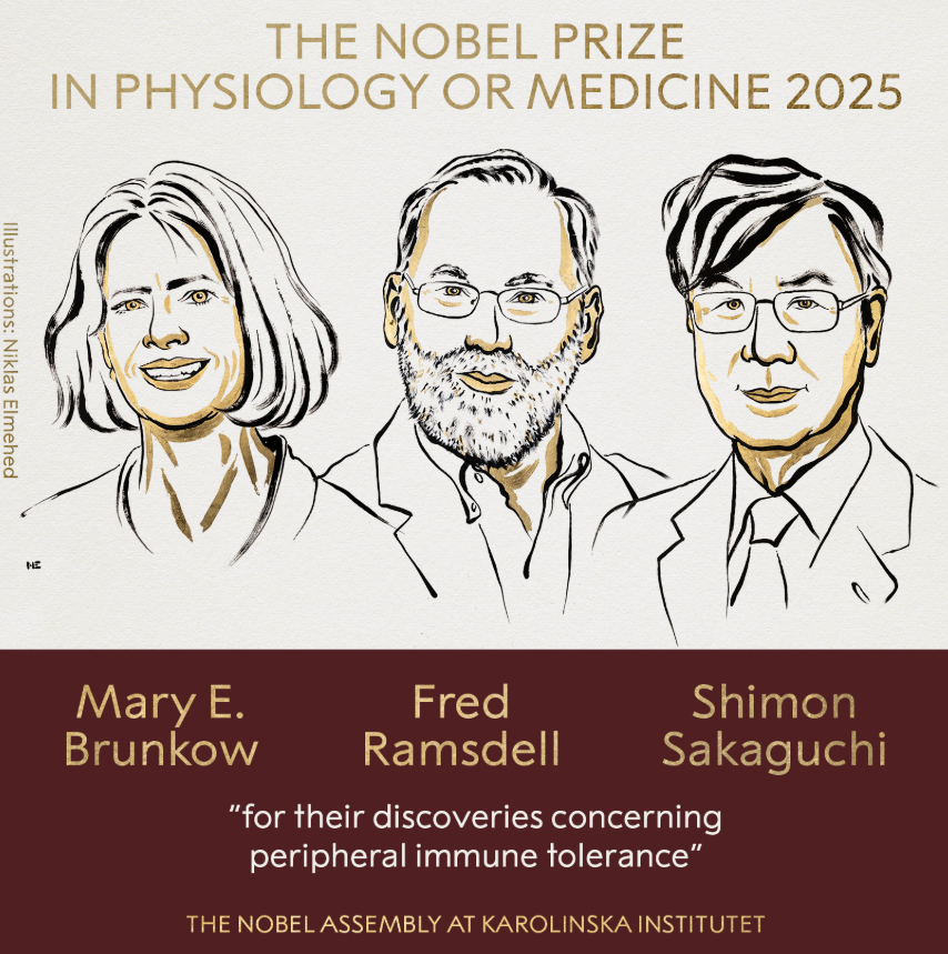 瑞典卡罗琳斯卡学院6日宣布,将2025年诺贝尔生理学或医学奖授予,玛丽·布伦科、弗雷德·拉姆斯德尔和坂口西蒙,以表彰其“在外周免疫耐受方面的发现”。随着诺贝尔生理学或医学奖的揭晓,2025年诺贝尔奖“开奖周”也正式拉开帷幕,其他五大奖项将逐次揭晓: