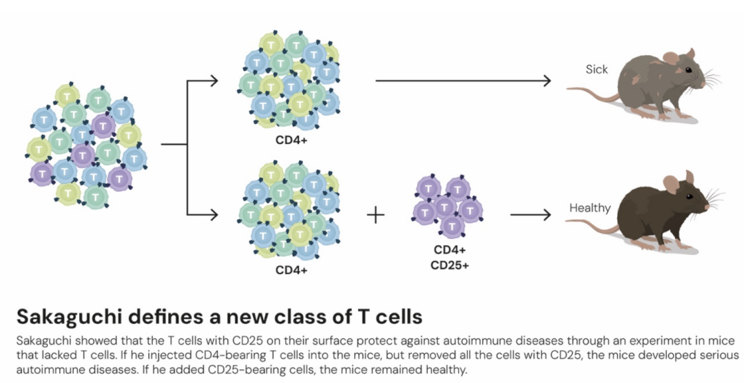 在此之后的两年,Shimon Sakaguchi将这些发现联系了起来。他证明了Foxp3基因控制着他在1995年所发现的那类免疫细胞的发育。这些细胞现在被称为调节性T细胞,它们负责监控其他免疫细胞,确保免疫系统能够容忍自身的组织。