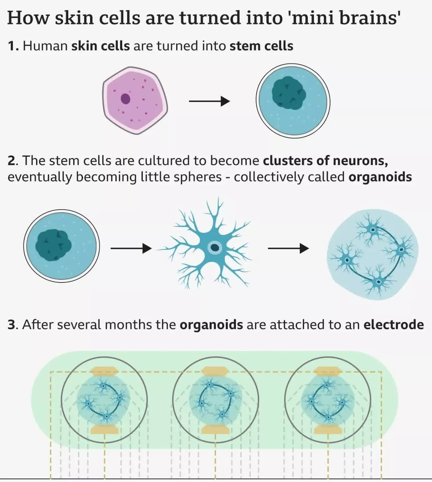 研究人员将干细胞培养为包括神经元及辅助细胞在内的细胞团块,称为“类器官”。这些微型脑状结构在培养皿内如小白球,虽拥有与人脑相同的细胞构成,却不具备复杂结构。经过数月时间,类器官成熟并可连接电极,科学家们试图在活体神经组织与传统计算机系统间进行电信号互通。