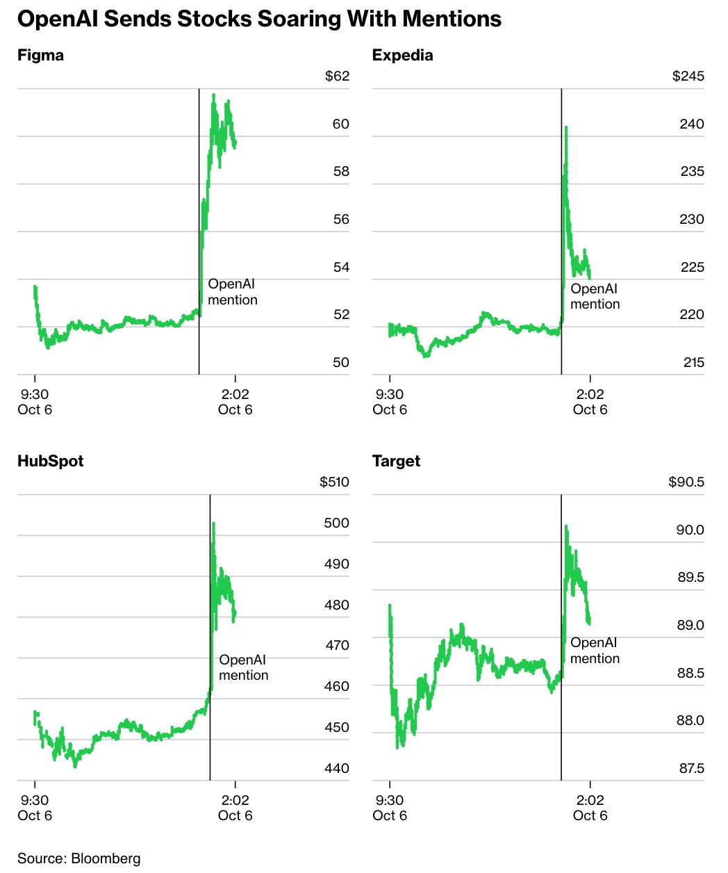 这家推出ChatGPT的公司于周一举行了年度开发者大会,演讲者仅仅提到了其他上市公司,其股票就迅速飙升。其中包括:Figma(FIG.US)上涨7.4%,HubSpot(HUBS.US)上涨2.6%,赛富时(CRMUS)上涨2.3%。在线旅游公司也出现了短暂的股价上涨,Expedia(EXPE.US)和TripAdvisor(TRIP.US)的股价一度上涨了7%,然后有所回落。玩具制造商美泰(MAT.US)的股价也上涨了近6%,尽管最终收盘几乎持平,该公司与OpenAI就Sora 2人工智能视频模型达成合作。