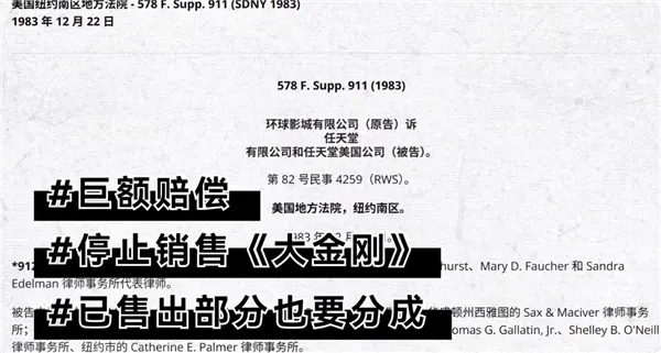 1983 年,环球影业将任天堂告上法庭,除了巨额赔偿外,还要求任天堂停止销售《 大金刚 》,已售出部分它也要分成。