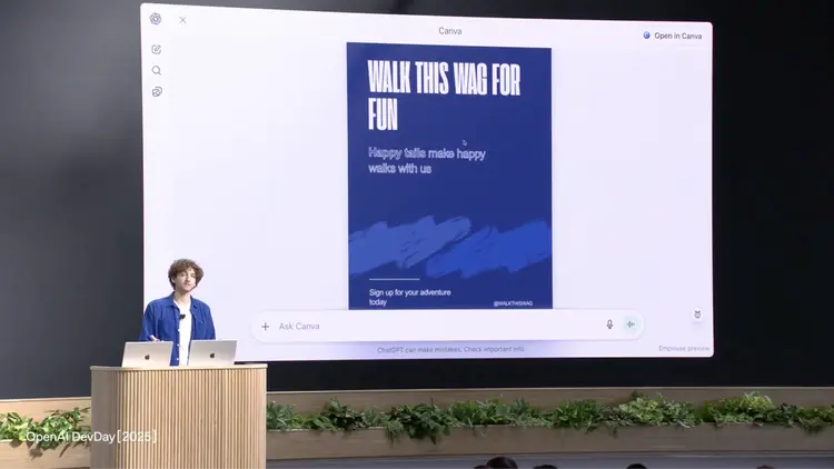 举几个现场演示的例子就能明白它的能力,Coursera应用可以在对话中嵌入视频播放器,用户边看课程边向ChatGPT提问;Zillow能展示可筛选的交互地图,用户说“找带院子的三居室”,地图实时过滤结果;Canva则能直接根据对话生成海报,并把海报转换成完整的PPT。