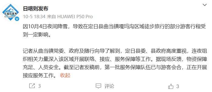 2025年10月5日18时许,“日喀则发布”微博账号发布情况说明称,因10月4日夜间降雪,导致部分游客行程受到一定影响。当地连夜组织相关力量深入该区域开展联络、接应、服务保障等工作。第一批服务保障队伍已与游客会合,正在开展接应服务工作。