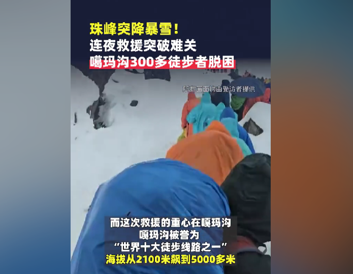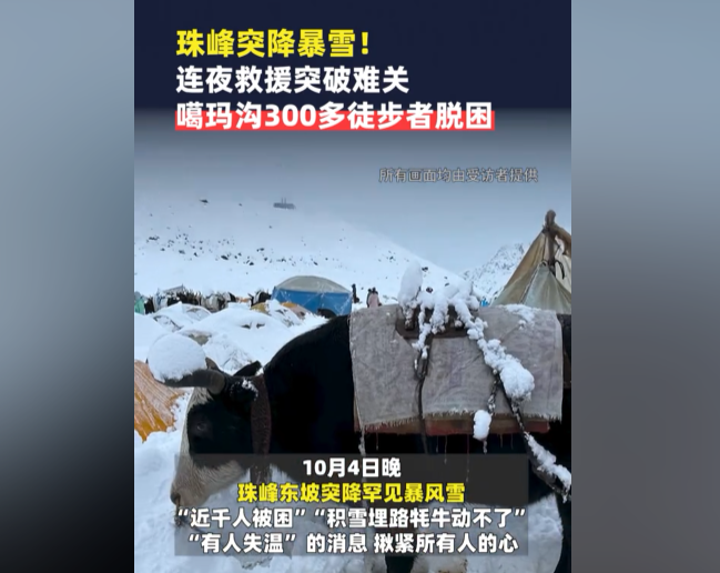 5日,有网友发布求助信息称,西藏海拔4900余米处的珠峰东坡营地突降暴雪,致近1000人被困无法下山。随后,“暴雪压垮大量帐篷”“或有近千人被困”“积雪过深,牦牛无法行动”“部分人员失温”等一系列消息传出。