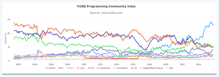 本月,C语言凭借C23版本的发布重回第二。但Java刚推出了Java 25版本,而C++也在忙于C++26版本的更新,因此谁能最终占据第二名仍难以预测。