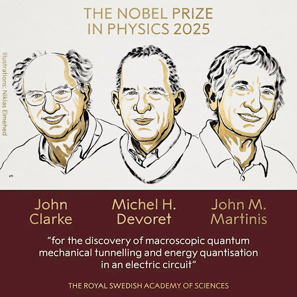 瑞典皇家科学院决定将2025年诺贝尔物理学奖授予——科学家约翰·克拉克、麦克·H·德沃雷特、约翰·M·马蒂尼,以表彰他们“发现电路中的宏观量子力学隧道效应和能量量子化”。获奖者将平分1100万瑞典克朗(约合836万元人民币)奖金。