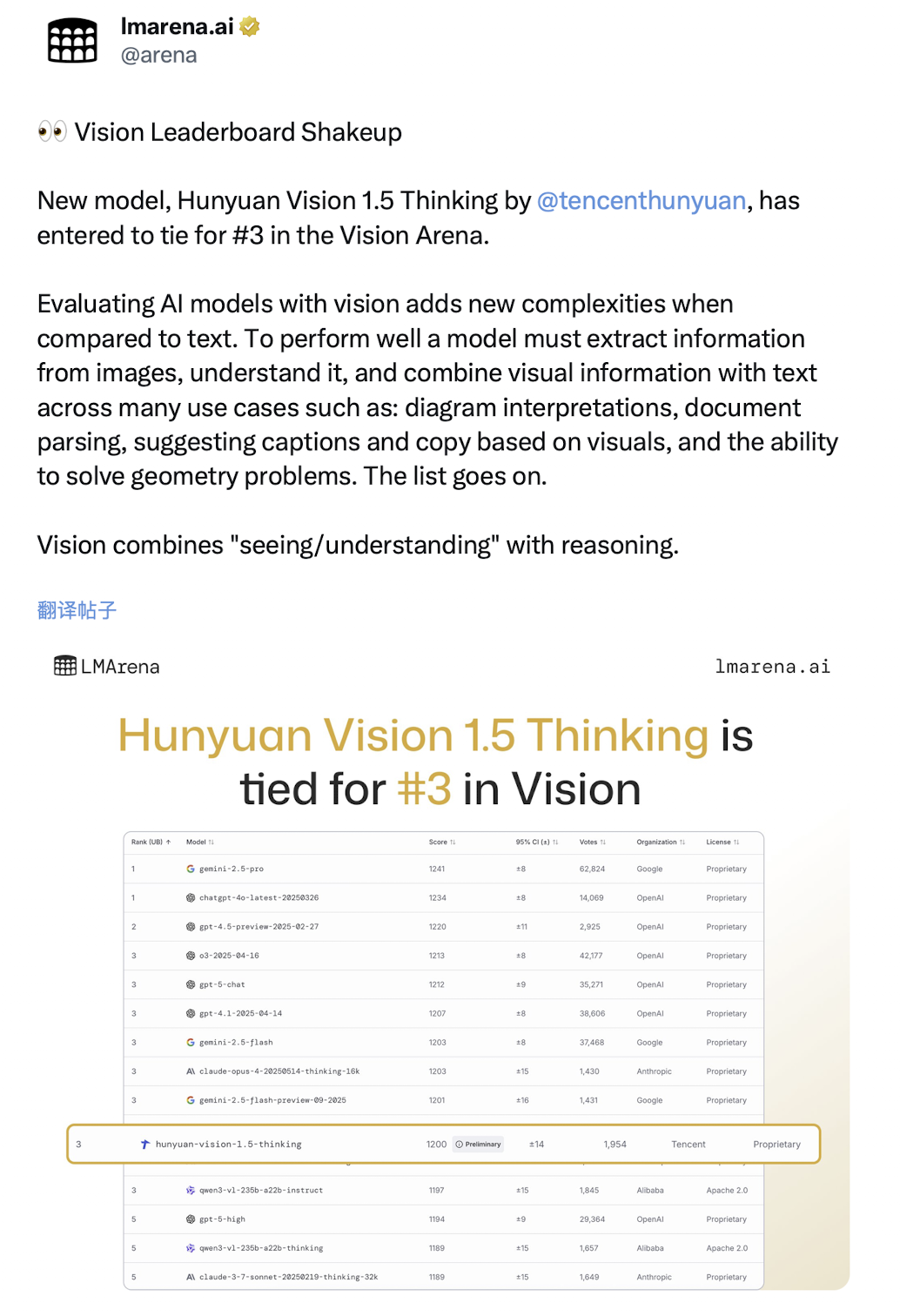腾讯混元视觉模型跻身全球Top 3 国内排名第1
