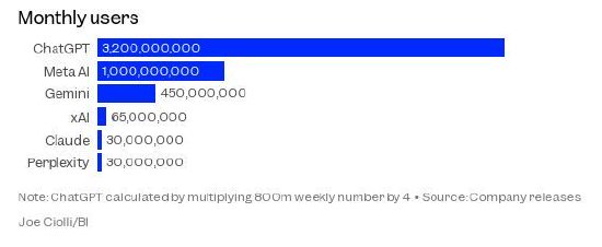 相比之下,Meta AI、谷歌的Gemini、xAI的Grok、Perplexity和Anthropic的Claude的月活跃用户总数为15.75亿,只有ChatGPT的近一半。(Meta AI的数据还包括所有公司平台的用户,而不仅仅是单一应用)