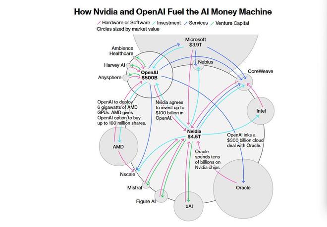 近期由这两家公司主导的一系列交易与合作,不断加剧外界的担忧:一个日益错综复杂、彼此勾连的商业交易网络,正在人为支撑起这场估值万亿美元的AI热潮。其影响已渗透至经济的各个角落,从债务、股权到房地产与能源,AI基础设施的建设浪潮正全方位地搅动全球市场。