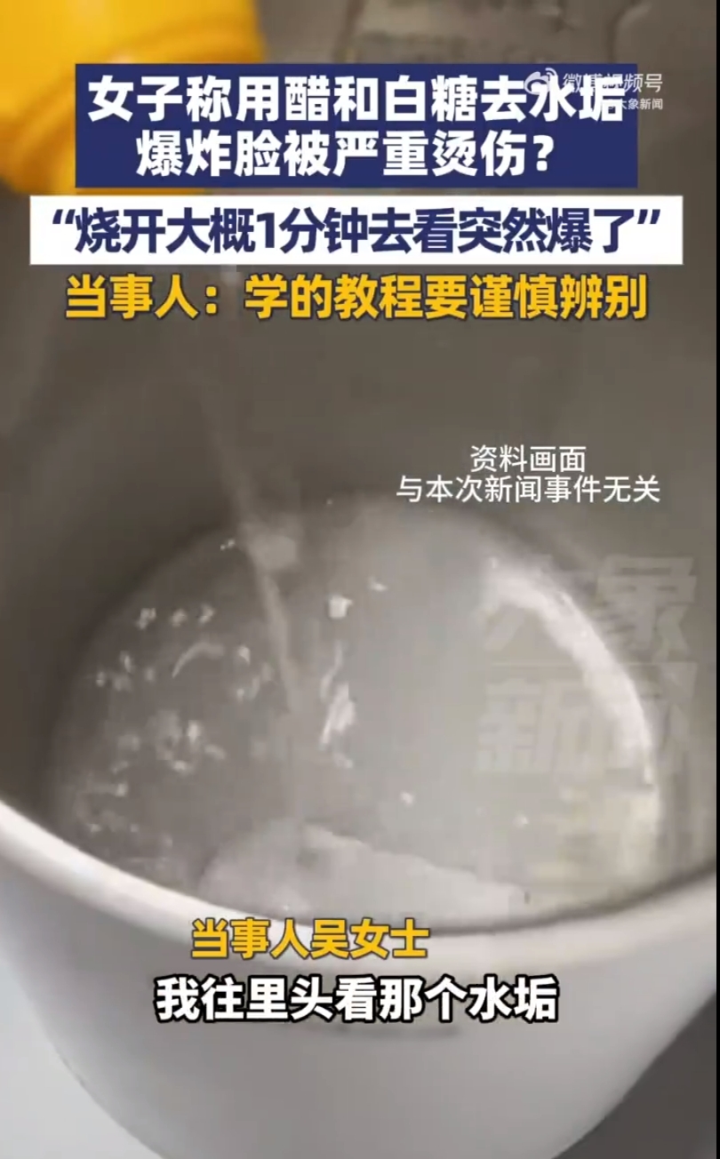 近日,河北邯郸一女子在尝试用醋+白糖混合烧水去除水垢,水烧开后约1分钟后突然爆炸,滚烫液体导致她面部严重烫伤。当事人描述回应称:保温壶有水垢,自己在网上搜了教程,用锅把白醋和白糖烧开倒进去去水垢,大概有一分钟,自己看有没有效果,一下就爆炸了,水一下喷到自己脸上,面部被烫。