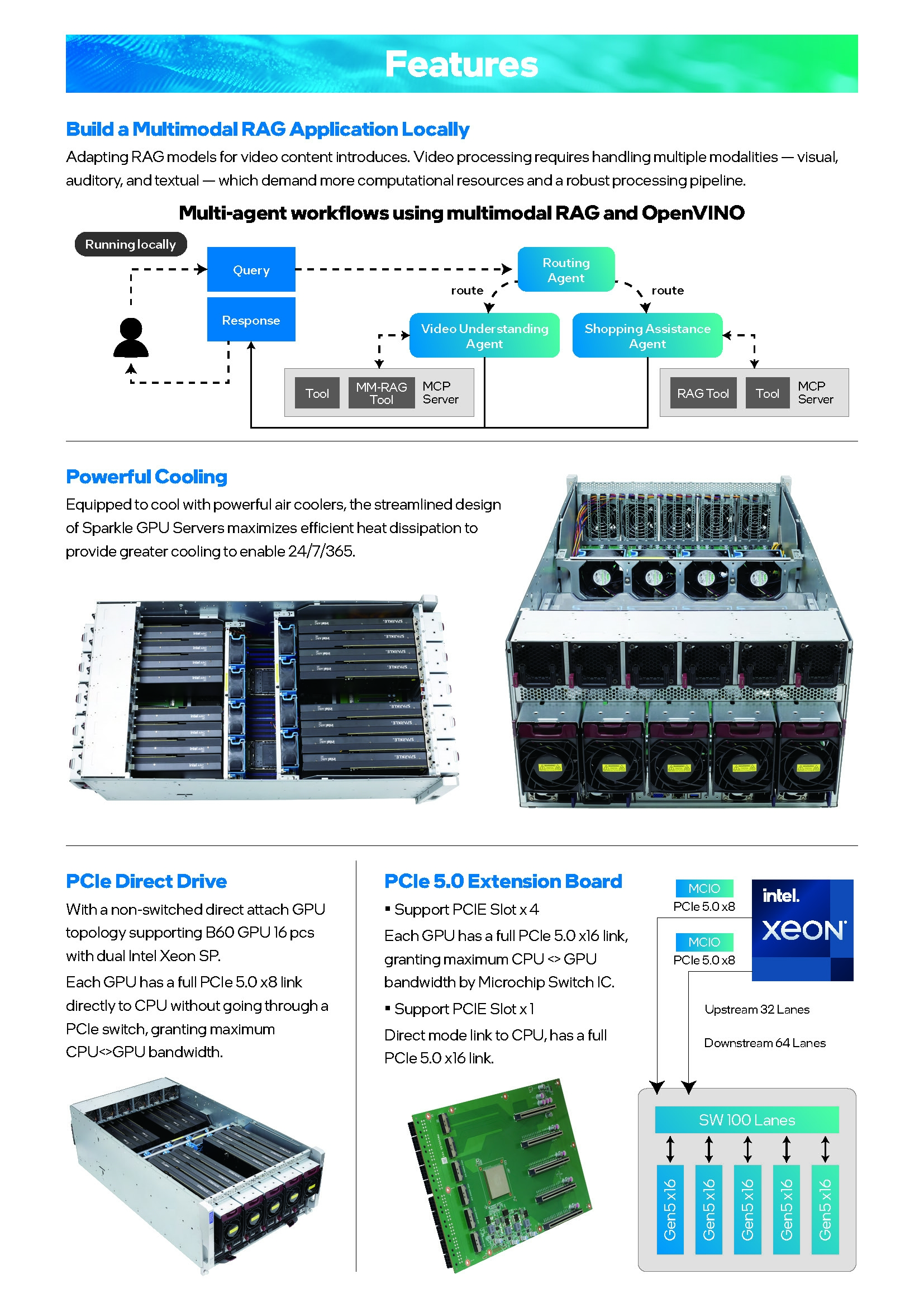 Intel的锐炫Pro B60工作站显卡最多只支持8卡并行,为此撼与加装了一颗Microchip的控制器,为整个系统提供了多达16条PCIe x16插槽,带宽均为PCIe 5.0 x8,此外还有两条处理器直连的PCIe 4.0 x16,用于安装高速网卡。
