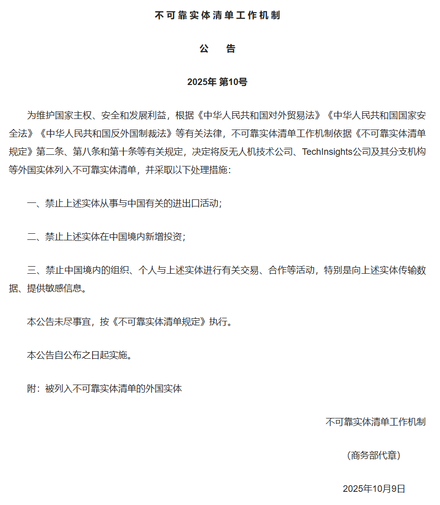 今日,商务部发布将反无人机技术公司等外国实体列入不可靠实体清单的公告。公告显示,根据《中华人民共和国对外贸易法》《中华人民共和国国家安全法》《中华人民共和国反外国制裁法》等有关法律,不可靠实体清单工作机制依据《不可靠实体清单规定》第二条、第八条和第十条等有关规定,决定将反无人机技术公司、TechInsights公司及其分支机构等外国实体列入不可靠实体清单,并采取以下处理措施: