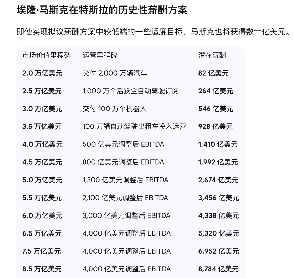 每项目标达成后,只要特斯拉市值同时达到2万亿美元至8.5万亿美元区间的相应里程碑,马斯克就能获得特斯拉1%的股份。