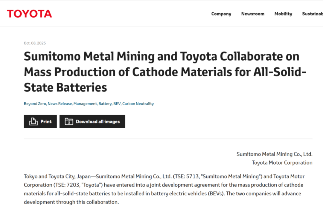 近日,丰田汽车通过全球官网宣布,已与住友金属矿山株式会社(下称 “住友金属矿山”)达成合作协议——双方将围绕纯电动汽车(BEV)用全固态电池正极材料的量产展开协作,共同加速相关技术的研发进程。