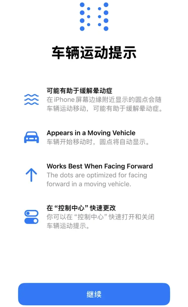 特斯拉的能量低回收模式显然属于第二条路径,而最近苹果在iOS 18推出的“Vehicle Motion Cues”则属于第一种。它通过屏幕边缘的动态点提示车辆的运动趋势,旨在降低视觉、前庭冲突,这一做法与车内光场屏等远焦成像的人因方案思路一致。