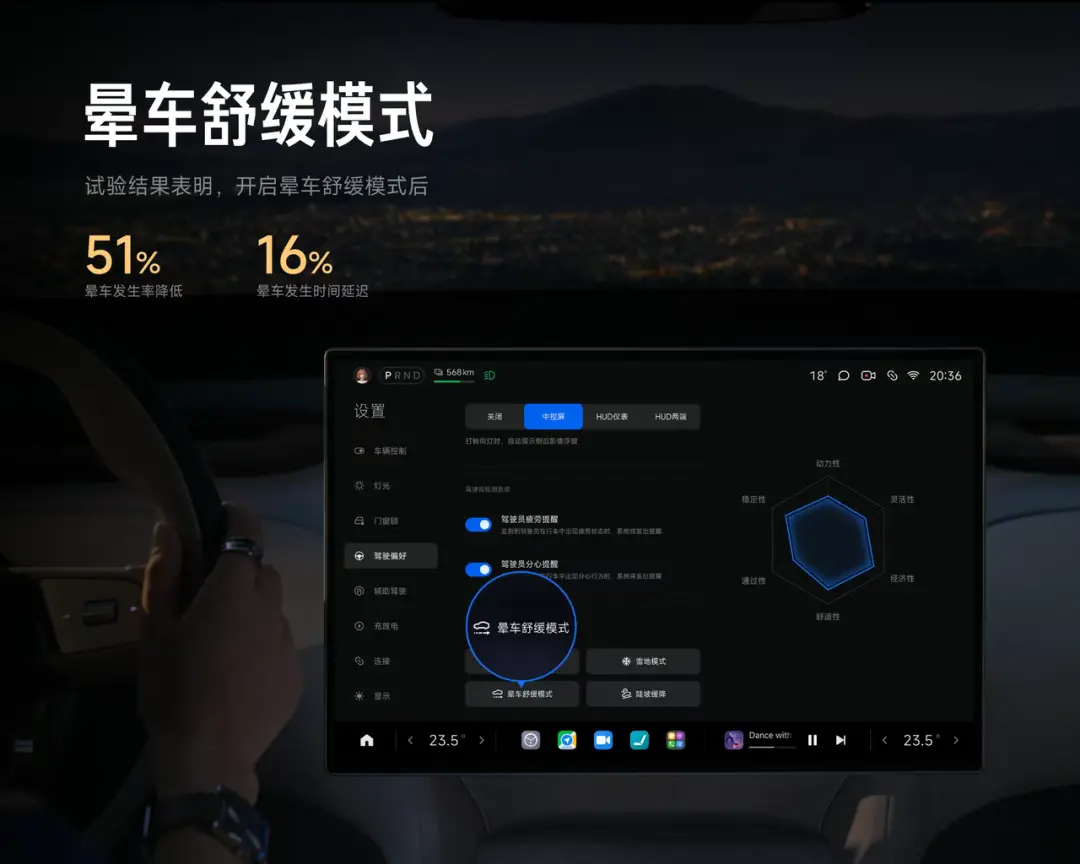 小米汽车雷军发布YU7时,也高调推出了“晕车舒缓模式”。他宣称,通过动力输出、能量回收和底盘悬架的专属调校,小米开发了晕车舒缓模式,该模式下加减速更舒缓、过弯更平稳,有效降低刺激感。在前期试验中,医院试验表明,晕车发生率降低51%,晕车发生时间延迟16%。