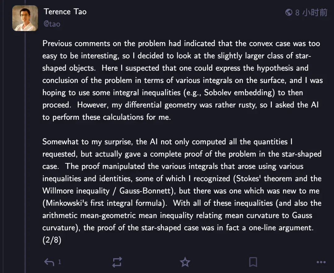 证明过程运用了各种不等式和恒等式,其中有些陶哲轩熟悉(比如Stokes定理和Willmore不等式),也有一个他也第一次接触的Minkowski第一积分公式。