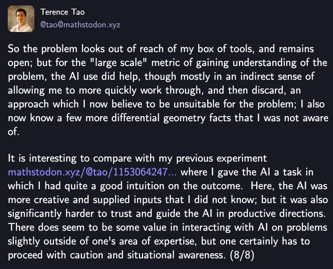 有了这次跨界解题的经验,陶哲轩对AI在学术研究上的作用也有了新的思考,他总结到: